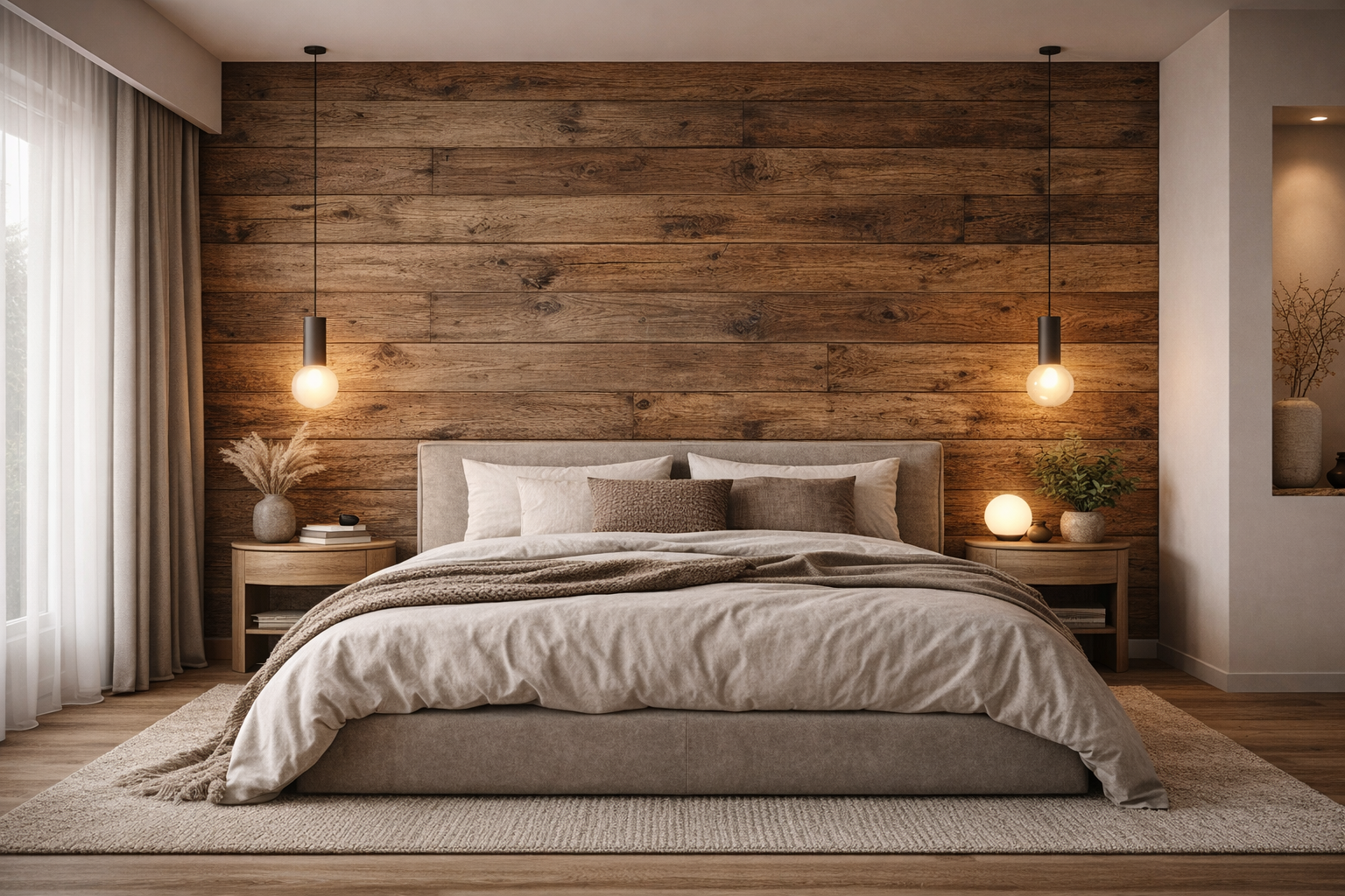 Deski w sypialni tworzą wyjątkowy klimat sprzyjający wyciszeniu i odpoczynkowi. Coraz większą popularnością cieszą się również rustykalne panele drewniane ścienne do sypialni, które pozwalają szybko i efektownie stworzyć naturalną ścianę akcentową.