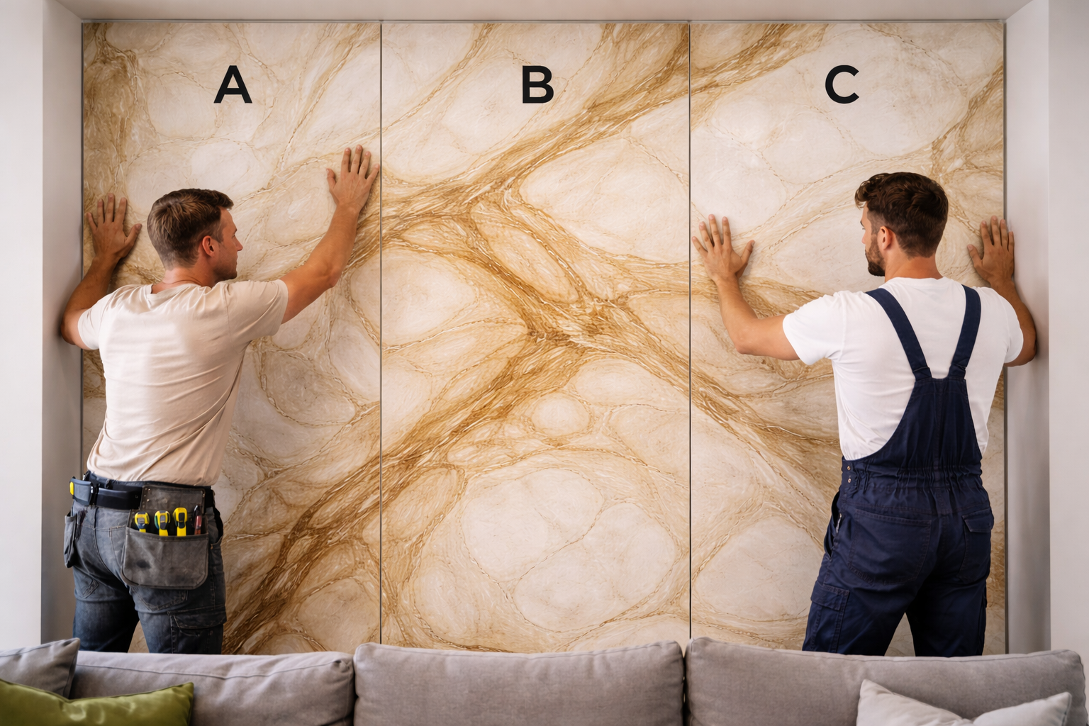 2️⃣ Wybierz wariant wzoru Podczas składania zamówienia istnieje możliwość bezpośredniego wyboru wariantu płyty: A, B lub C. Dzięki temu masz pewność, że otrzymasz dokładnie ten element wzoru, którego potrzebujesz do stworzenia spójnej kompozycji ściany. Odpowiedni dobór wariantów pozwala na prawidłowe połączenie żyłkowania i uzyskanie efektu jednolitej, estetycznej powierzchni przy montażu kilku paneli obok siebie.