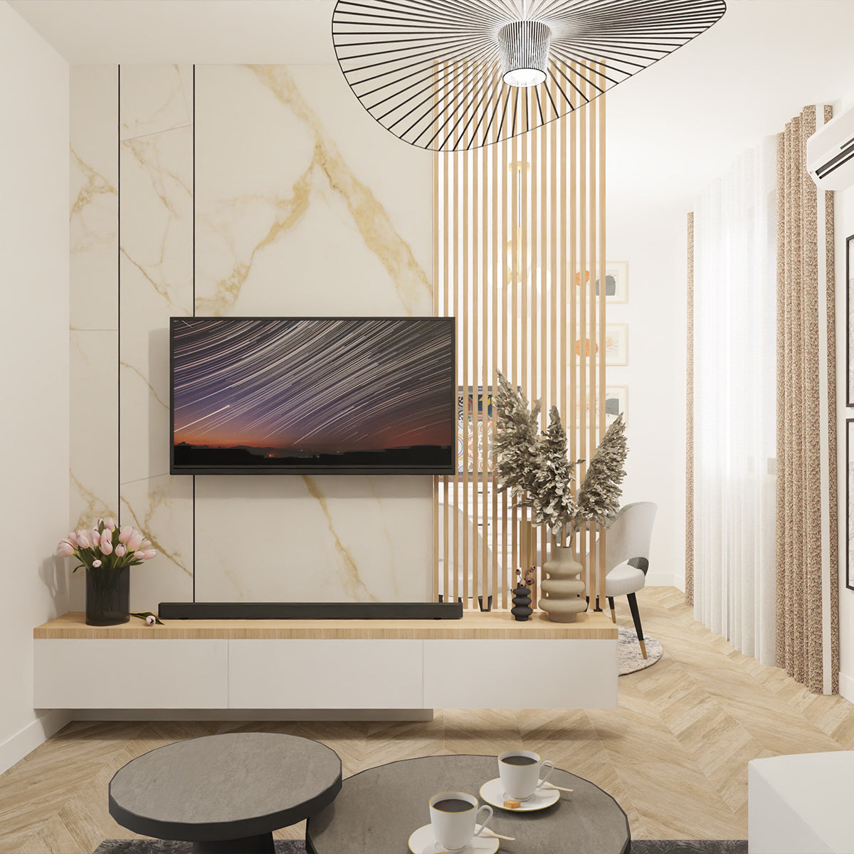 Ściana RTV z WPC maskuje drobne nierówności podłoża i tworzy elegancką, spójną kompozycję z meblami i oświetleniem LED.