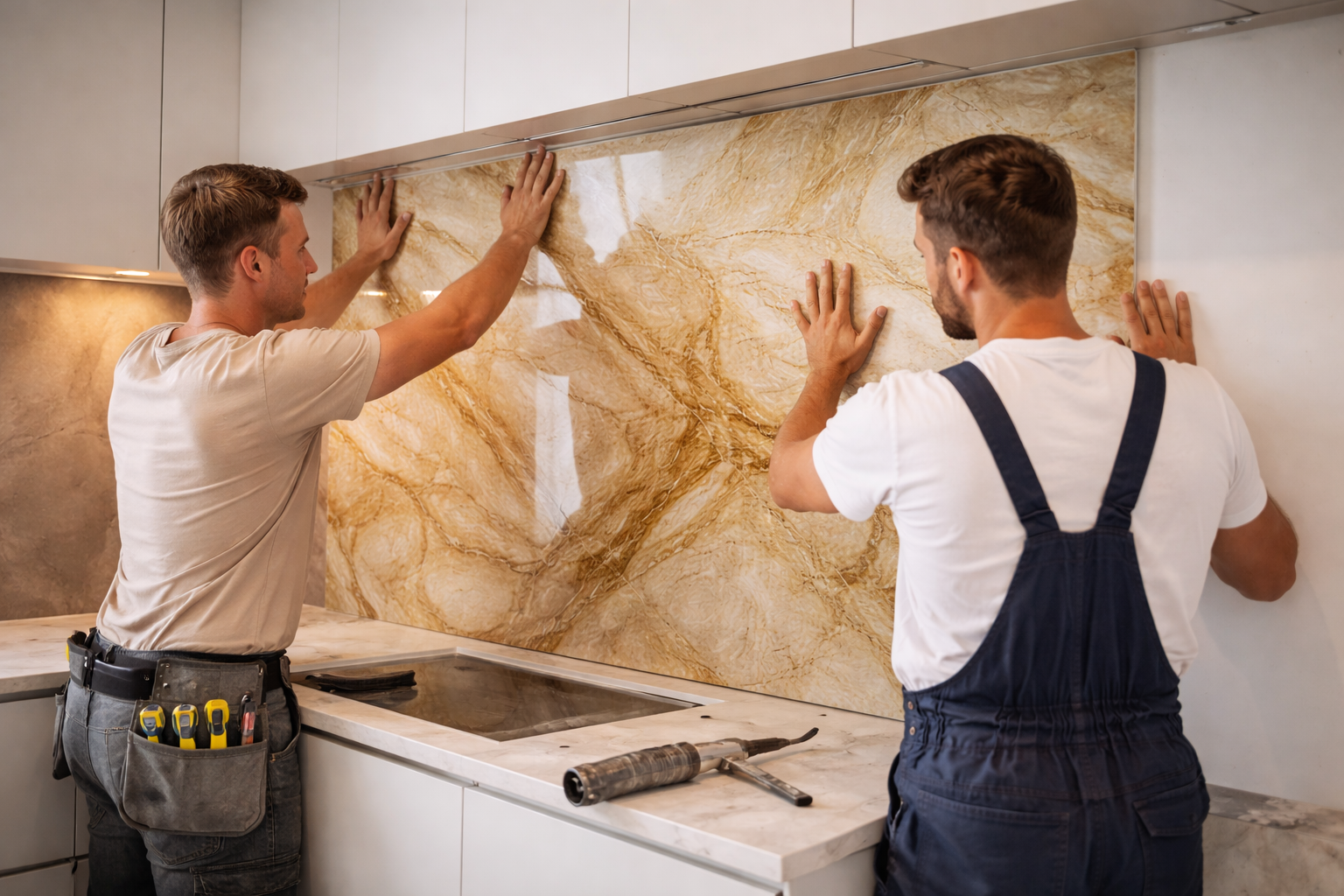 Płyty ścienne WPC do kuchni – złoty marmur między szafkami a blatem