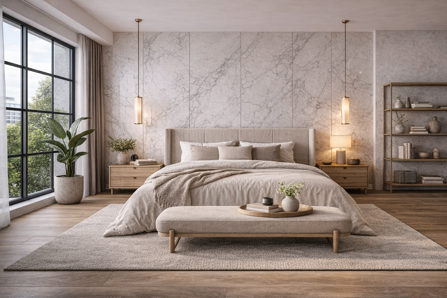 Panele WPC w wykończeniu marmurowym, drewnopodobnym lub minimalistycznym pozwalają stworzyć przytulną, ale nowoczesną przestrzeń sprzyjającą wyciszeniu. Delikatna struktura i wyraźna linia paneli podkreślają strefę łóżka, nadając sypialni charakteru.